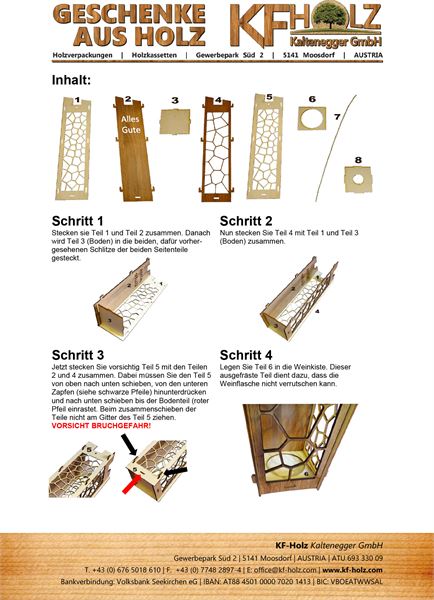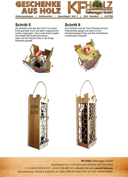 Nun brauchen Sie nur noch das Weintragerl mit der Aufbauanleitung zusammenstecken, eine gute Flasche Wein besorgen und schon ist ihr exklusives, einzigartiges Geschenk fertig.