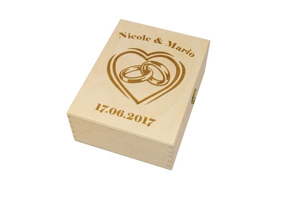Unsere Holzkiste mit Klappdeckel ist mit dem Motiv "Herz mit 2 Ringen" versehen. Zusätzlich können sie die Namen des Brautpaares und das Hochzeitsdatum eingravieren lassen. Verpackt werden können verschiedene Leckereien, Gutscheine sowie auch Geldgeschenke, die ja ohne Verpackung immer etwas unpersönlich sind.