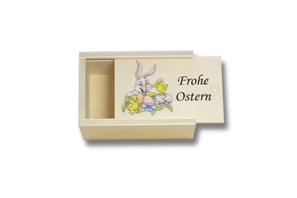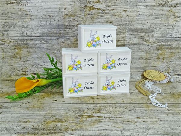 Sie haben mehrere Kinder, Enkelkinder, Nichten & Neffen, die sie beschenken wollen. Kein Problem. Dann ist unser 5er Set von den wunderschönen Holzboxen mit Osterhasen bedruckt, genau das Richtige. Sie befüllen Ihre kleinen, aber feinen Holzboxen mit ein paar Leckerein und wenn Sie wollen noch ein paar Scheinchen dazu und fertig ist ihr Ostergeschenk.