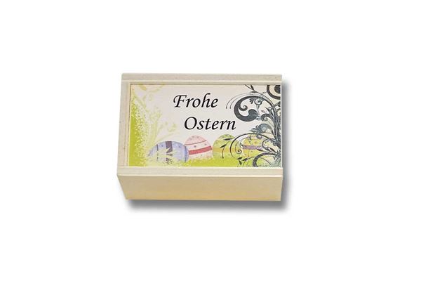 Versehen mit dem schönen buntem Ostergruß ist die Holzbox ein richtiger Hingucker.
