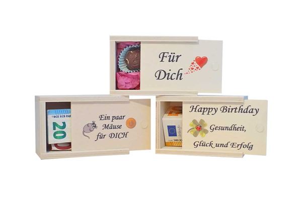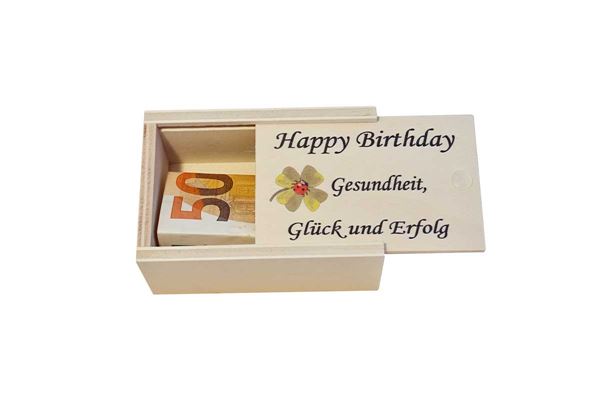Sie möchten Ihr Geld nicht einfach nur so verschenken oder brauchen eine Geschenksverpackung für Schmuck, Gutscheine oder eine kleine Aufmerksamkeit. Dann ist die Holzbox "Happy Birthday" genau das Richtige für Sie.