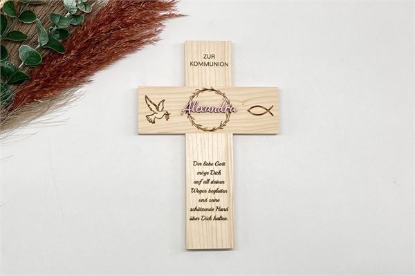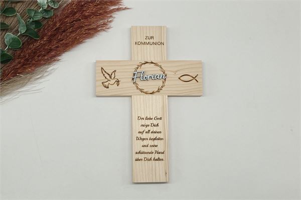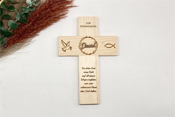 Personalisiertes Holzkreuz aus naturbelassener Fichte zur Erstkommunion - Ein symbolträchtiges Geschenk für einen bedeutsamen Anlass.