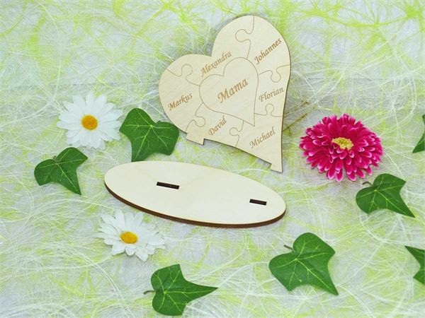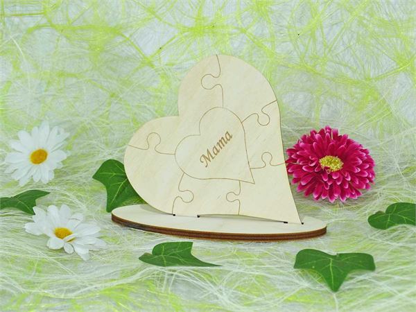 Das Herz ist nicht durchgeschnitten, sondern die Puzzleteile nur grafisch dargestellt. Durch den mitgelieferten Sockel kann das Muttertagherz aufgestellt werden und findet sicher einen schönen Platz im Haus oder der Wohnung.