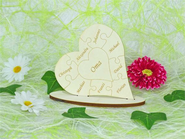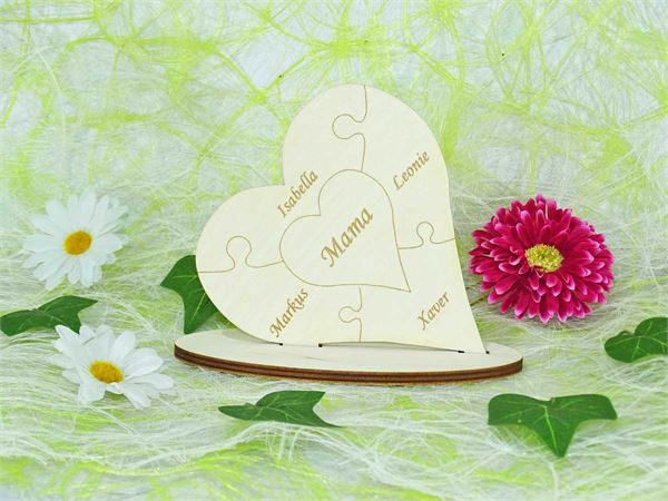 Das Muttertagsherz kann auch ohne Namen und nur mit der Puzzlegravur bestellt werden, damit die Kinder das Herz selbst gestalten können.