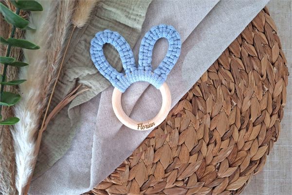 Ein liebevolles Erinnerungsstück und treuer Begleiter für kleine Entdecker: Der personalisierte Greifling aus Holz mit handgeknüpften Makramee-Hasenohren vereint Natürlichkeit, Stil und individuelle Gestaltung in einem besonderen Babyspielzeug.
