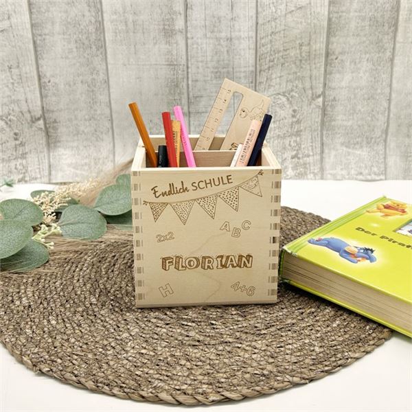 - 🖍 Stiftebox aus hellem Holz mit Gravur „Endlich Schule“, Buchstaben & Rechenzeichen