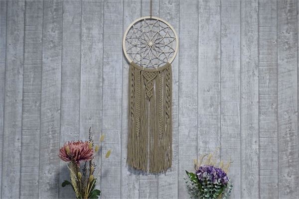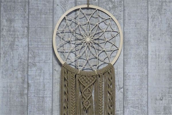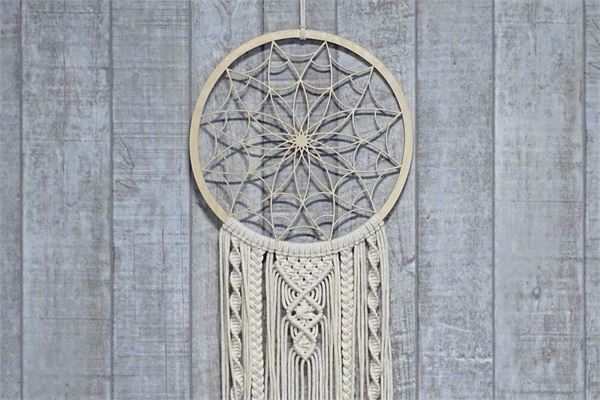 Das aufwendige Makramee-Geflecht, das den Holzring umgibt, wurde mit viel Liebe zum Detail von Hand geknüpft. Die kunstvollen Muster und Knoten im Makramee verleihen dem Traumfänger eine einzigartige und handgefertigte Struktur.