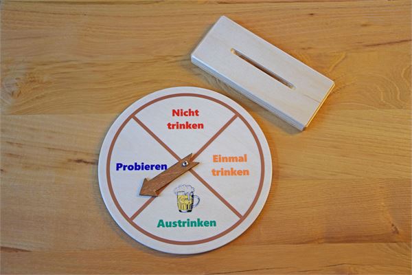Ein Fußballabend unter Männern, ein schöner Grillabend mit Freunden oder einfach eine gemütliche Runde, unser Bierroulette ist das perfekte Partyspiel. Mit diesem Trinkspiel kann es nur ein lustiger Abend werden.Mit dem Roulette wird es sicher lustig, da der Pfeil immer nach unten und somit auf "Austrinken" zeigen wird. Um das Spiel spannender zu machen, können Sie die runde Scheibe auch auf den Tisch legen und so spielen, wie früher beim Flaschendrehen. Das war doch immer lustig! Egal ob zum Valentinstag, Vatertag, Geburtstag, als Dankeschön für eine Einladung - mit dem Bierroulette haben sie im Handumdrehen ein außergewöhnliches Geschenk für jeden Anlass. Dies wird mit Sicherheit ein Geschenks-Hit für jeden Partygeist.