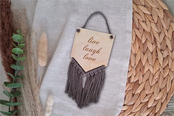 Setze positive Akzente in deinem Zuhause mit dem charmanten Wandschild „Live, Laugh, Love“ aus Holz und Makramee.